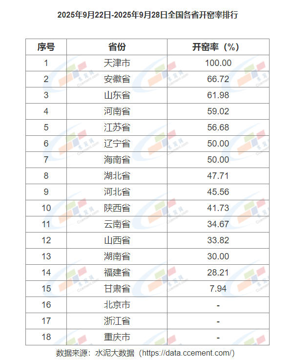 2025年9月22日-2025年9月28日全國(guó)各省開(kāi)窯率排行